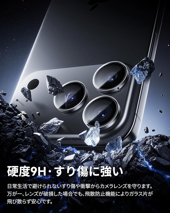 「カメラレンズをしっかり守る」9Hの高硬度強化ガラスを採用し、アイフォン 17プロ/ 17プロマックスのレンズをしっかり守ります。鍵などの硬く尖ったものが接触しても、簡単には傷がつきません。1.5メートルの高さから落下させるテストもクリアしており、万が一の時もレンズをしっかり保護します。また、飛散防止設計により、割れてしまった場合でも破片が飛散せず安全性が高い保護フィルムです。黒縁部分にはアクリル素材を採用し、さらに保護力をアップしました!