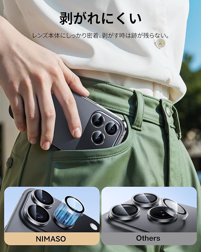 「ARコーティング・超高画質維持」最先端のAR(Anti-Reflection)コーティング技術により、高透過率を達成しました。レンズ周囲を黒縁仕上げにすることにより、フラッシュ時の乱反射を抑え、写真の白飛びを防止。iPhone本来の撮影画質を損なわず、フレアやゴーストを大幅に低減し、夜間撮影もクリアな画質をキープします。NIMASO独自の高い品質で、アイホン 17pro/ 17promaxのカメラ本来の高画質と優れた描写性能を十分に生かす商品です。