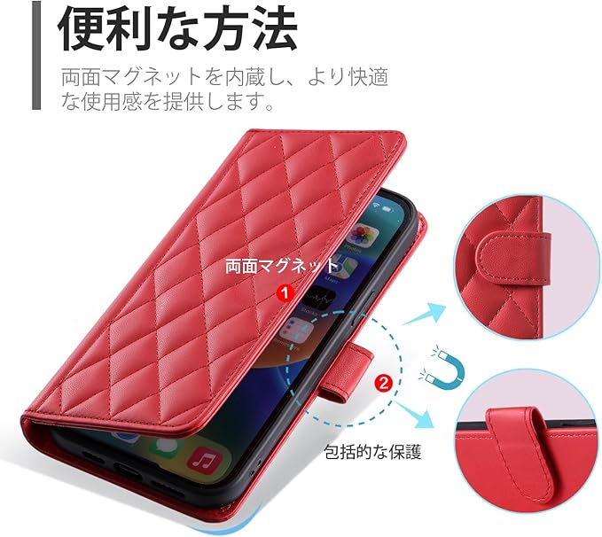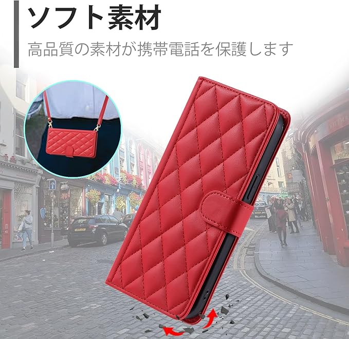 laddutoi ケース 用の iphone 17 proケース 防塵 おしゃれ ストラップ付き スタンド機能 カード収納 軽量 薄型 耐衝撃 高級PUレザー 滑り防止 財布型 内蔵マグネット 開閉式 チェック柄 上質 耐摩擦 マグネット式 肩掛け 斜め掛け-レッド