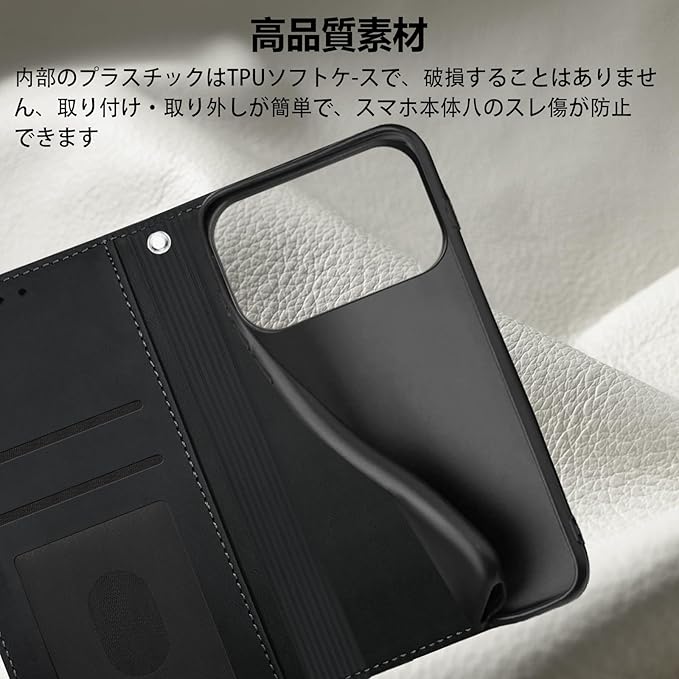 【高級PUレザー】 柔らかく丈夫な高品質のPUレザーを使用しており、表面の感触は素晴らしく、落ち着いた色とシンプルなデザインが優雅さと高級感を際立たせています。高品質のPUレザーと柔軟なTPU保護カバーを組み合わせることで、頑丈な二重保護を実現し、お使いの携帯電話を 360 度保護し、iPhone 17 Pro を落下や傷から守ります。