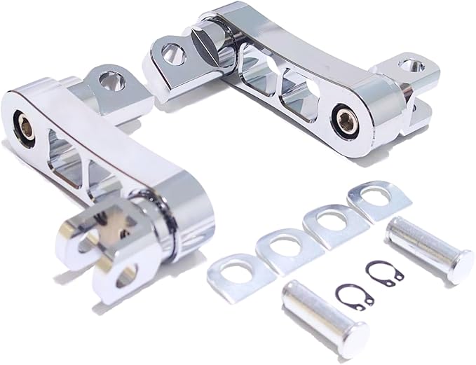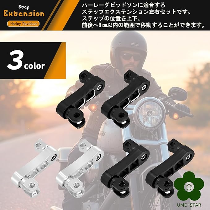 ハーレー ダビッドソンに適合するステップ エクステンション左右セットです。ステップの位置を上下、前後へ9cm以内の範囲で移動することができます。 フットペグの位置を自分好みに調整できるので、ゆったりとした姿勢で快適にかっこよく乗り回すことができます。