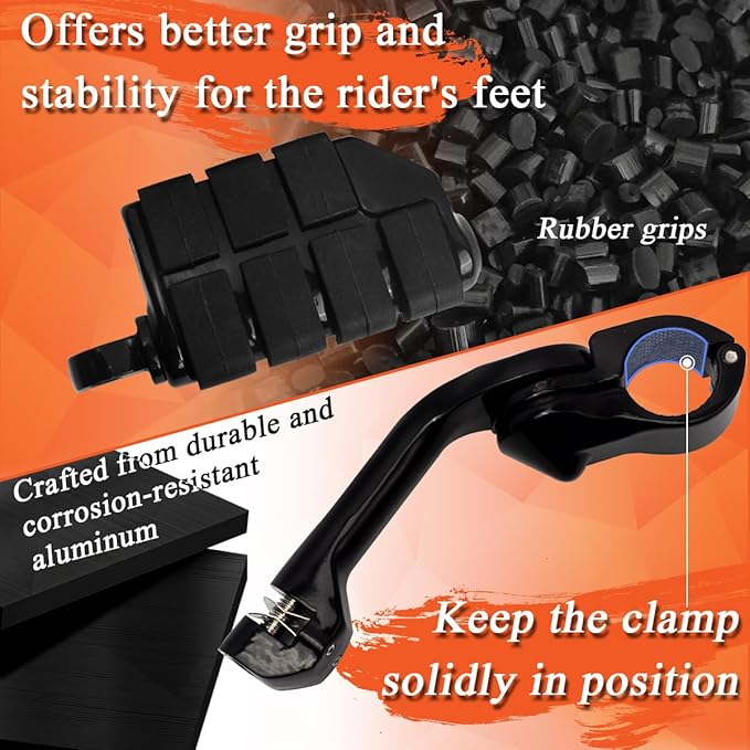 [高品質構造] 耐久性と耐腐食性のアルミニウム素材で作られたこれらのフットペグは長持ちするように作られています。 毎日のライディングの厳しさに耐え、長持ちするパフォーマンスを提供するように設計されています。