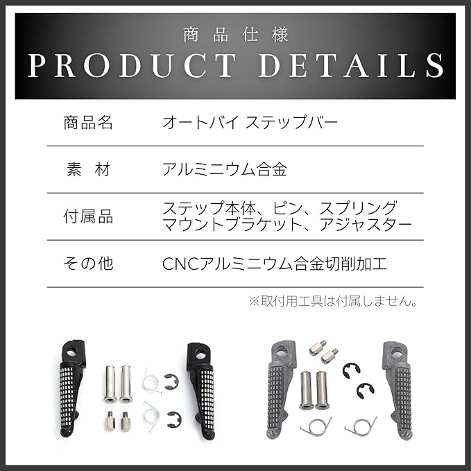 【簡単取り付け】付属品にはステップ本体、ピン、スプリング、マウントブラケット、アジャスターが含まれており、簡単に取り付け可能です。