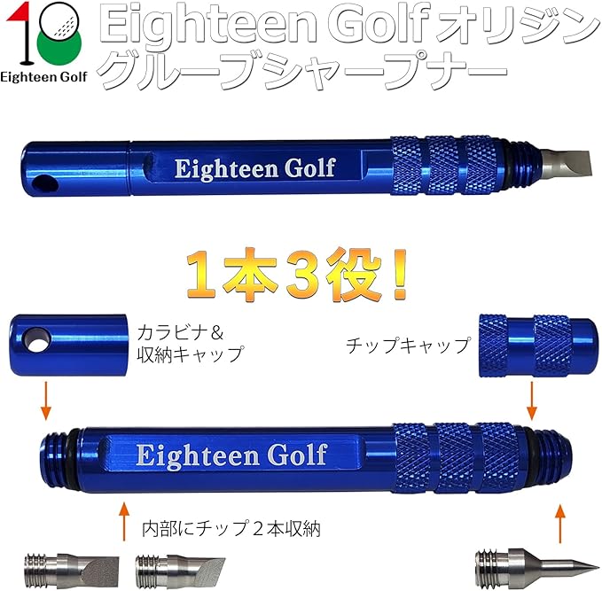 Eighteen Golf ゴルフ シャープナー ビット3本付き 溝研磨ツール チップ収納式 クラブ溝メンテナンス 3種類チップ付き グルーブクリーナー アイアン ウェッジ対応 携帯便利 滑り止めグリップ仕様
