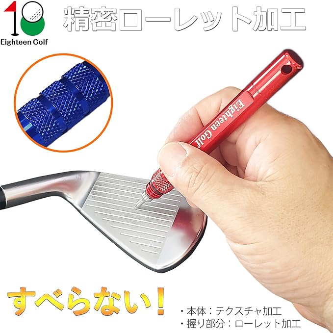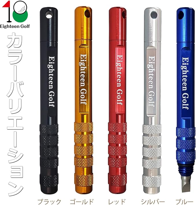 アイアンやウェッジのスピン性能、落ちていませんか? 「Eighteen Golf ゴルフシャープナー」は、クラブフェースの溝をしっかり研磨して、スピン性能と操作性を取り戻すプロ仕様ツール 付属の3種類の交換チップを使い分けて、あらゆる溝形状に対応可能 チップは高硬度ステンレス製で耐久性も抜群 滑りにくいローレット加工付きで扱いやすい カラーバリエーションも5色展開で、自分のスタイルに合わせて選べる