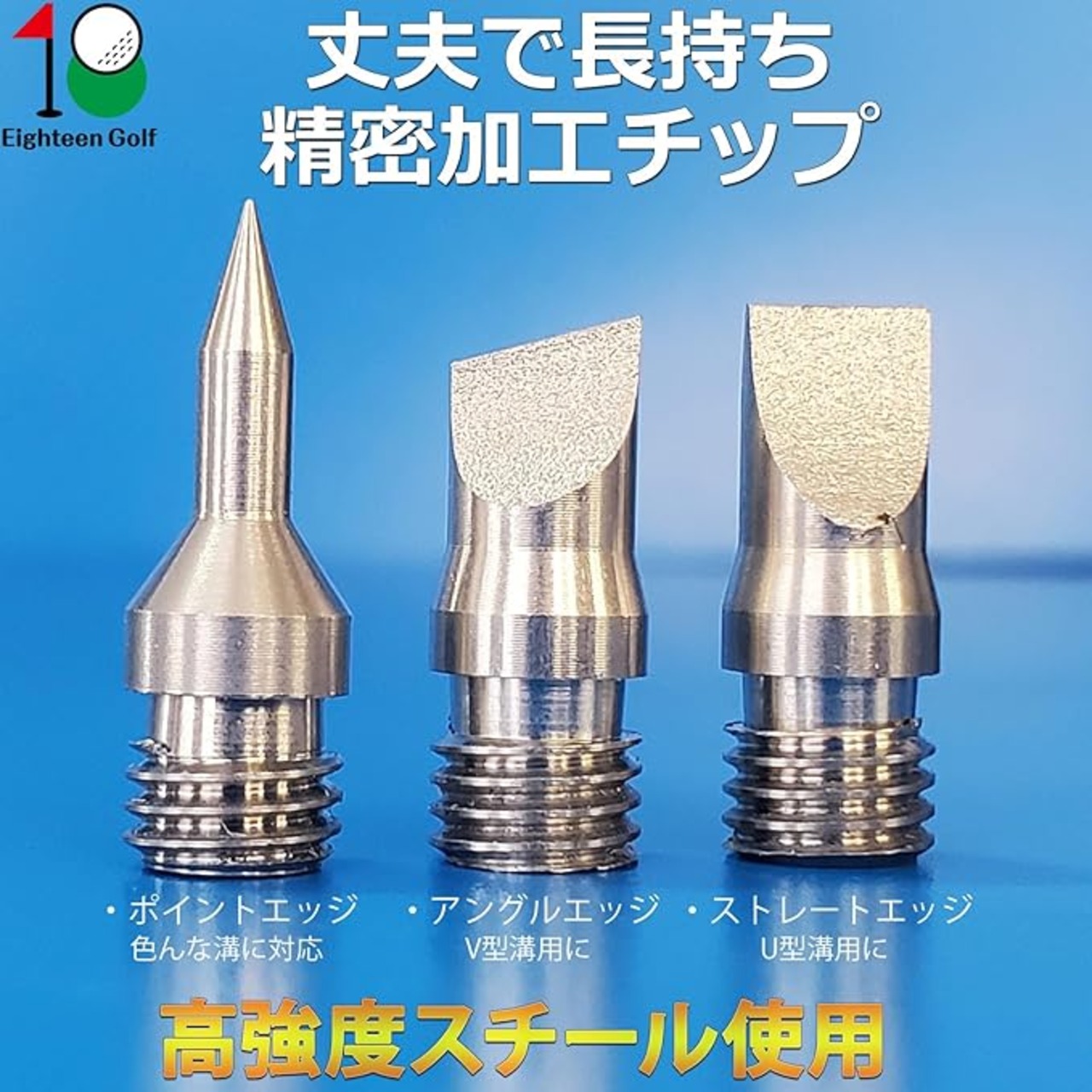 【3種類の交換チップ付き】アイアンやウェッジの溝形状に合わせて使い分け可能。
