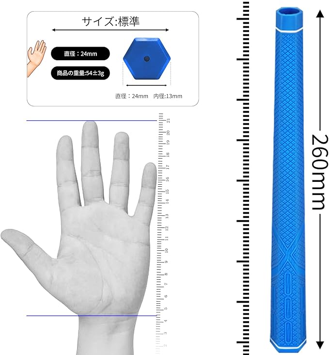 【製品仕様】 ゴルフグリップのセット内容:13本セット、サイズ:標準、重さ:約57g、素材:ゴム製、口径: 標準的な0.58インチ(14.7mm)長さ:約26.4cm。シャフト挿入口側が外径約1.6cmで、グリップエンド側が外径が約2.7cmです。