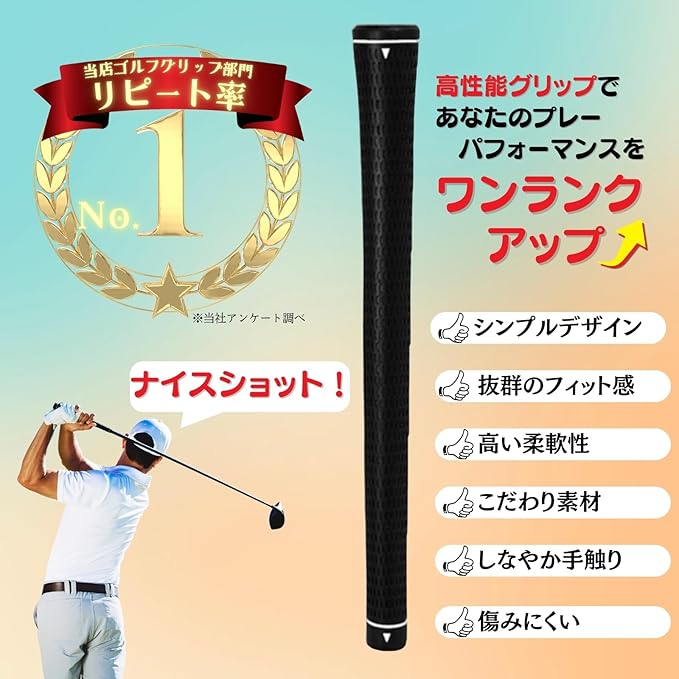 ✅天然ゴム素材の防滑、耐摩耗性に優れた高耐久ゴルフクラブグリップです。一般的なM58(58口径)ですので、アイアン・ウエッジ・ドライバー等様々なクラブにご利用いただけるスペックを備えているのも魅力的です。抜群のホールド感、フィット感を実現し、ゴルフ初心者から中級者、上級者まで幅広い層に親しまれ、検索ランキングでも上位の人気標準スタンダードモデルラバーです。