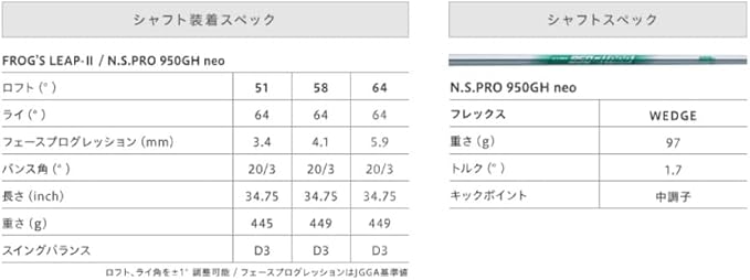 ロフト角:58度、ライ角:64度、フェースプログレッション:4.1mm、バンス角:20/3度、長さ:33.5インチ、重さ:376g、スイングバランス:C7