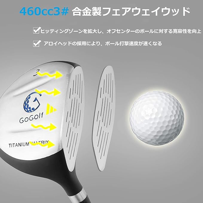 【460cc合金製フェアウェイウッド】 3# ゴルフクラブは、最適な重心位置で高い打ち出しを実現するために、ヘッドに重みを持たせています。また、このクラブは、子供がより速くボールを打つことができ、より高く長い飛行を実現するために、より長く、より柔らかいシャフトを装備しています。