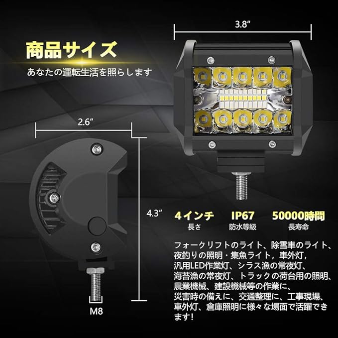 ❤包装内容&保証:LED作業灯*2個、バイクステー*1セット、2灯用リレーハーネス*1、保証カード*1 初期不良で返品或いは交換することになった時、不良品の点灯状態画像をご提供お願い致します。