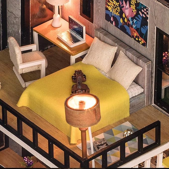 本商品はミニチュアのドールハウスの手作りキットになります。現代モダンな、都会の豪華な一軒家といった佇まいの二階建てのドールハウスです。繊細でリアルな小物が可愛い♪ライトは実際に点灯します。