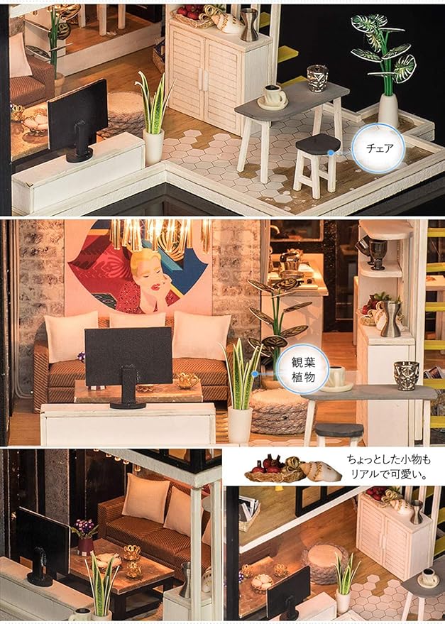 moin moin ドールハウス ミニチュア 手作りキット セット 芝生の 広いベランダ 二階建て 現代モダン LEDライト + オルゴール + アクリルケース