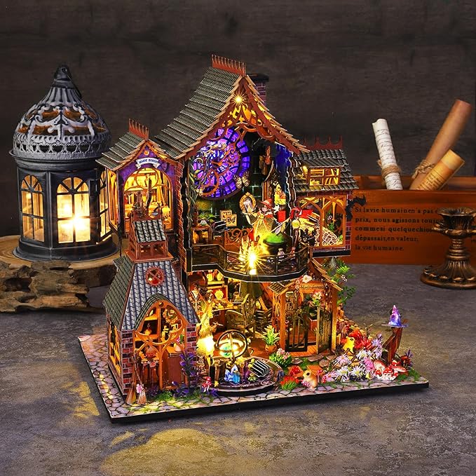 Spilay DIY 城建物情景のモデル木ドールハウス模型, ミニチュア ドールハウス 手作りキット セット 初心者向け-(マジック ハウス)+LEDライト、防塵カバー -誕生日、休日、クリスマスプレゼント (Magic forest)ES015