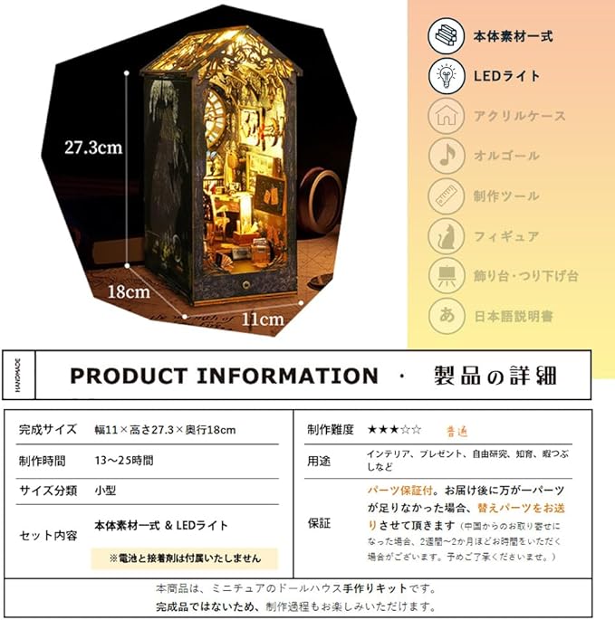 【完成サイズ】 幅11 高さ27.3 奥行18cm 【サイズ分類】 小型 【制作時間】 13~25時間 【制作難易度】 ★★★☆☆(普通) 【セット内容】 素材一式&LEDライト 【保証】:パーツ保証付。お届け後に万が一パーツが足りなかった場合、迅速に替えパーツをお送りさせて頂きます。
