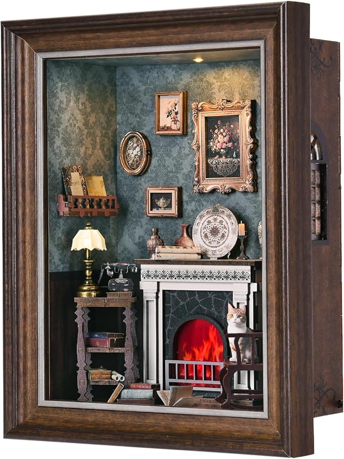 ブックヌークキット - 3D木製パズル LEDスイッチコントロール&壁掛けフレーム付き 初心者向けDIYミニチュアハウス クラフト愛好家のための本棚/卓上/壁装飾 ドールハウスギフト (暖炉)