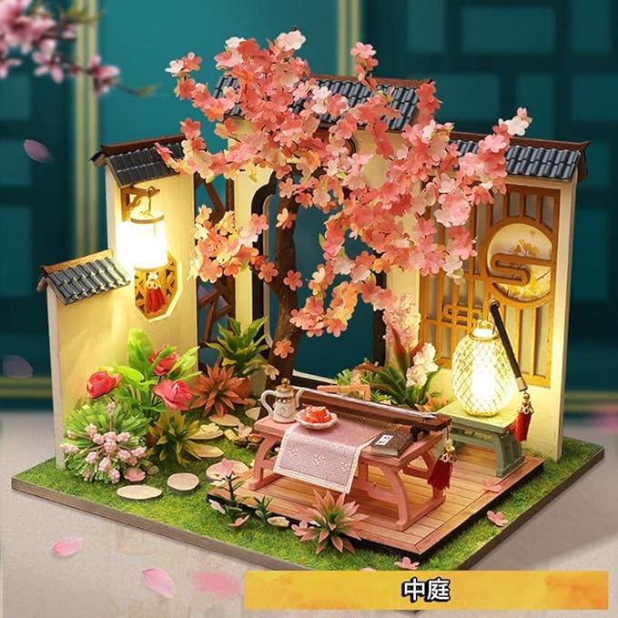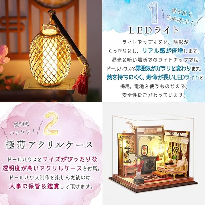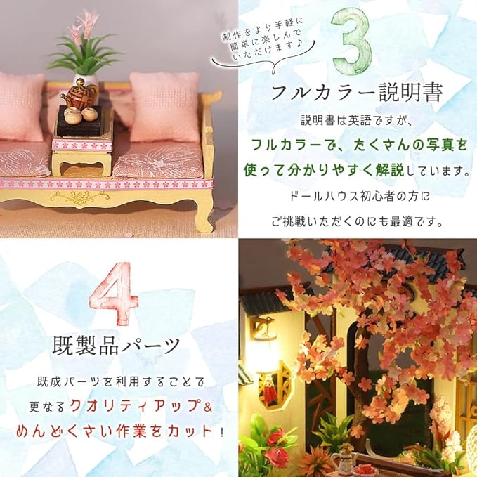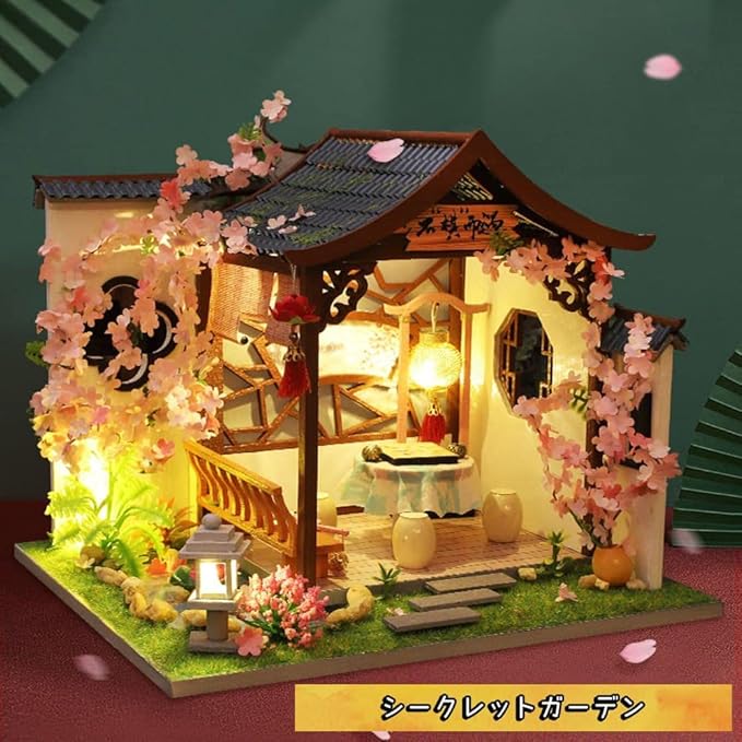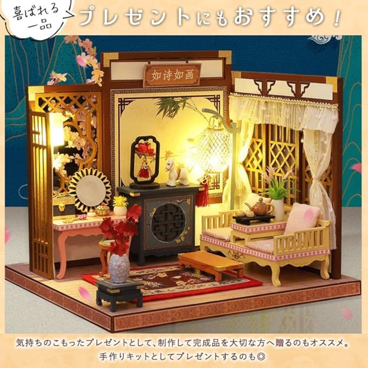 本商品はミニチュア・ドールハウスのDIY手作りキットになります。大きな桜がパッと目を惹きつけられる、中華デザインのドールハウス。光がゆらゆらと小さな小さな家具を照らす様子は心癒されます…♪