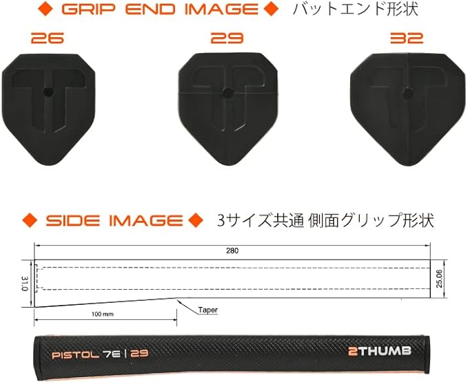 「2THUMB」から、初めて登場したピストル形状のグリップ「PISTOL 7E」 は、常に同じところで握りやすいよう、特殊なV 字の形状になっています。 横幅はバット側もチップ側も同じで、グリップ背面がテーパーしています。 3つのサイズとも、バット側の厚みは31mm、チップ側の厚みは25.6mm となっていて、パットを沈めたい方におすすのめモデル。