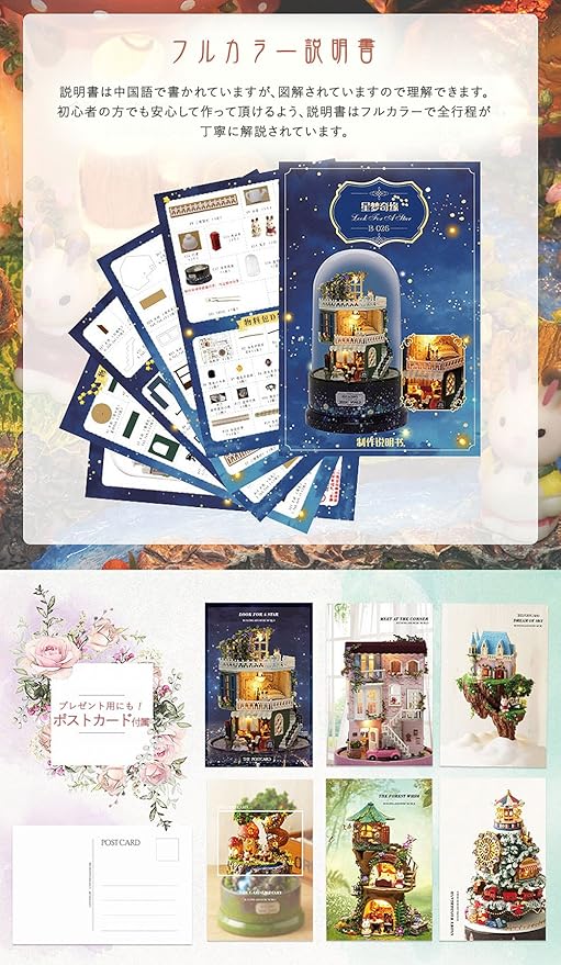 本商品はミニチュアのドールハウスの手作りキットになります。インテリアにも最適な、手のひらサイズの小さなドーム型のドールハウスです。小さいのに、近くで見てもリアル。ライトも実際に点灯します。オルゴールは回転式で、くるくる回ります。ギミックが凝っていて楽しいドールハウスです。