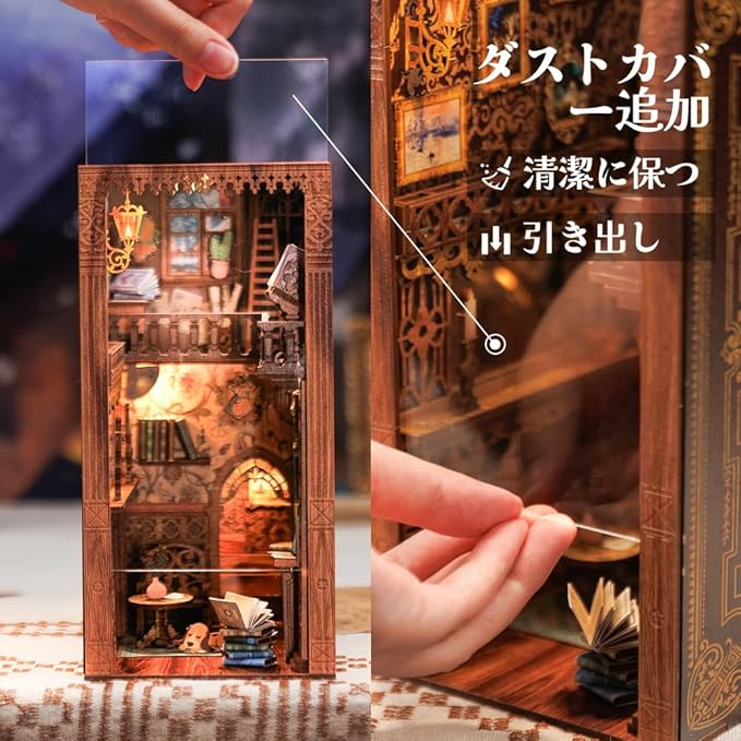 【ダストカバーとLEDライト付きミニチュア ブックヌック】このドールハウス ブックヌックのデザインは、普通の手工芸品のレベルをはるかに超えた精巧なディテールに満ちています. 美しいだけでなく、この物置を効果的に保護し、掃除を楽にするダストカバー付きです. LEDが醸し出す雰囲気、どんな環境でも魅力的に映ります. 実用性と美しさを兼ね備えたユニークな製品です