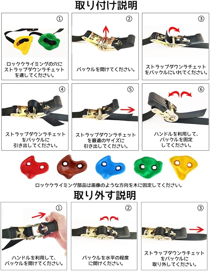 【5色のクライミングホールドがある】このクライミングホールドセットは可愛い5色の18個のクライミンググリップと6件の300cmストラップダウンラチェットがあります。大人のロッククライミング用品よりシンプルですが、滑り止め力や安全性がおとりませんです。