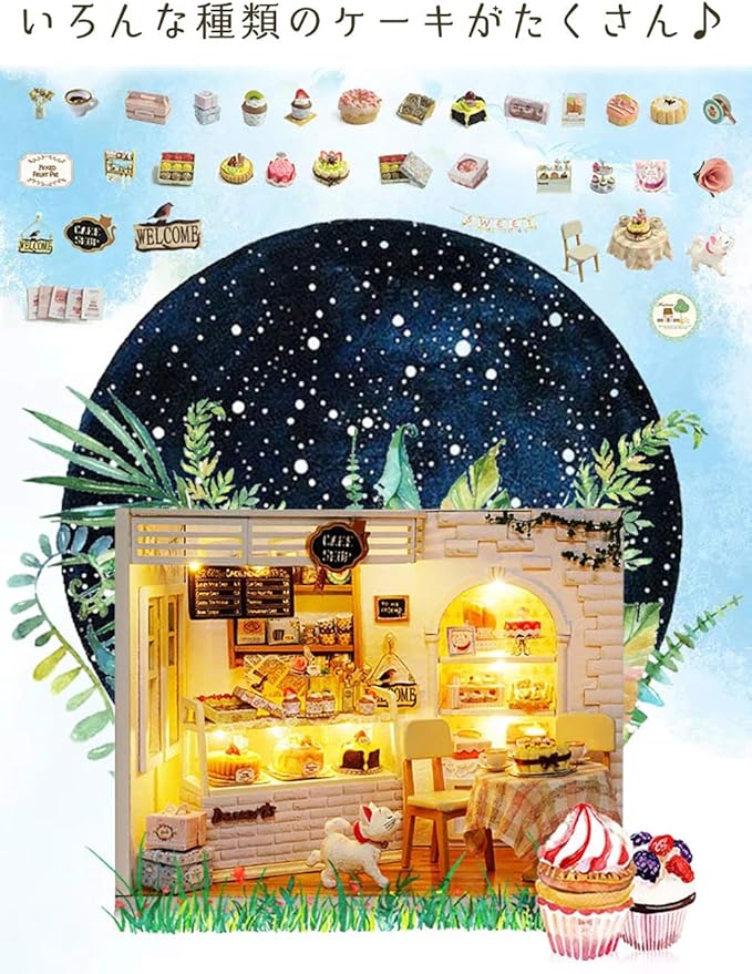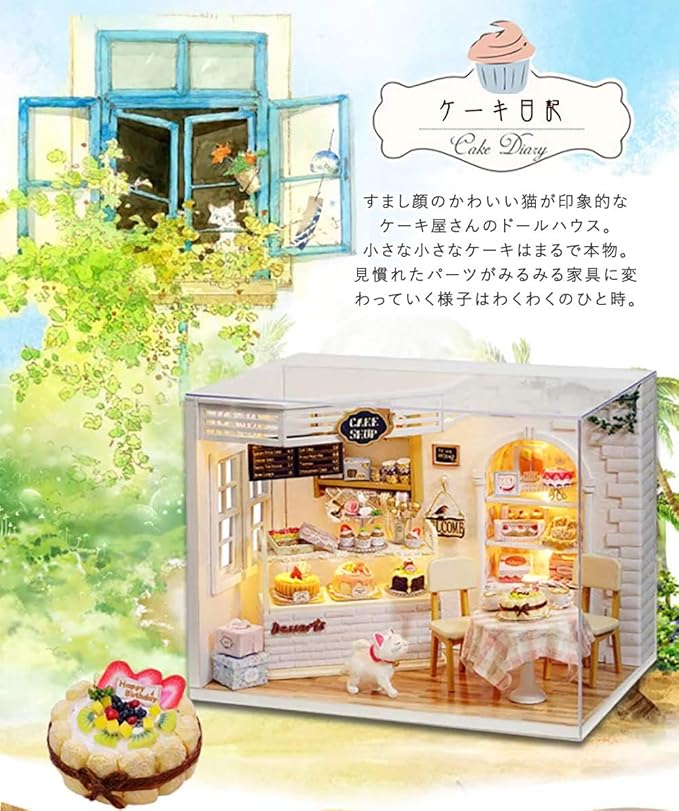 moin moin ドールハウス ミニチュア 手作りキット セット ドールハウス 猫のケーキ日記 | ケーキ屋さん | LEDライト + アクリルケース 2004DH150