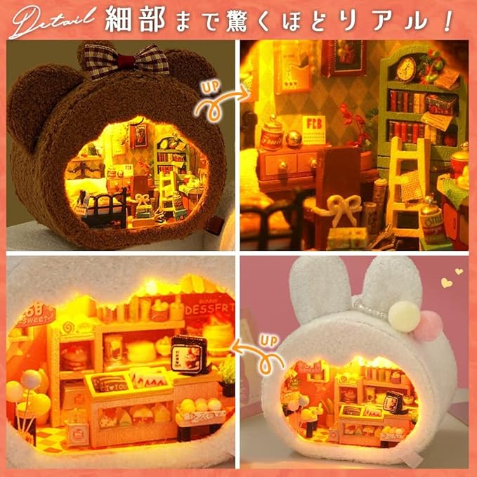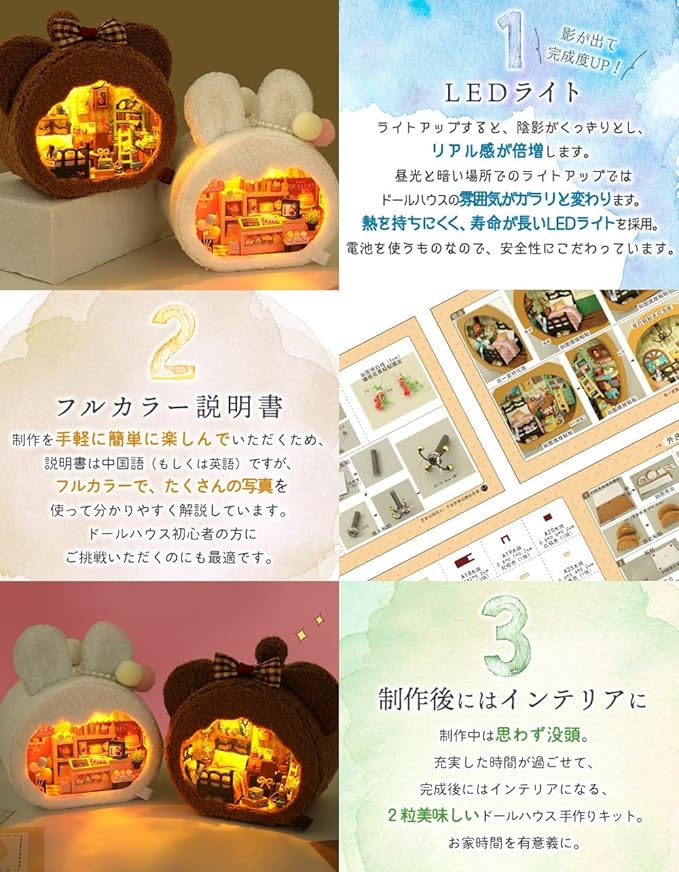 moin moin ドールハウス ミニチュア 手作りキット セット 【 英語説明書 】 ふわふわ アニマル フェイス ハウス くま リボン テディベア ブラウン 初心者 手のひらサイズ 作る インテリア LEDライト + 製作ツール 2303dh381