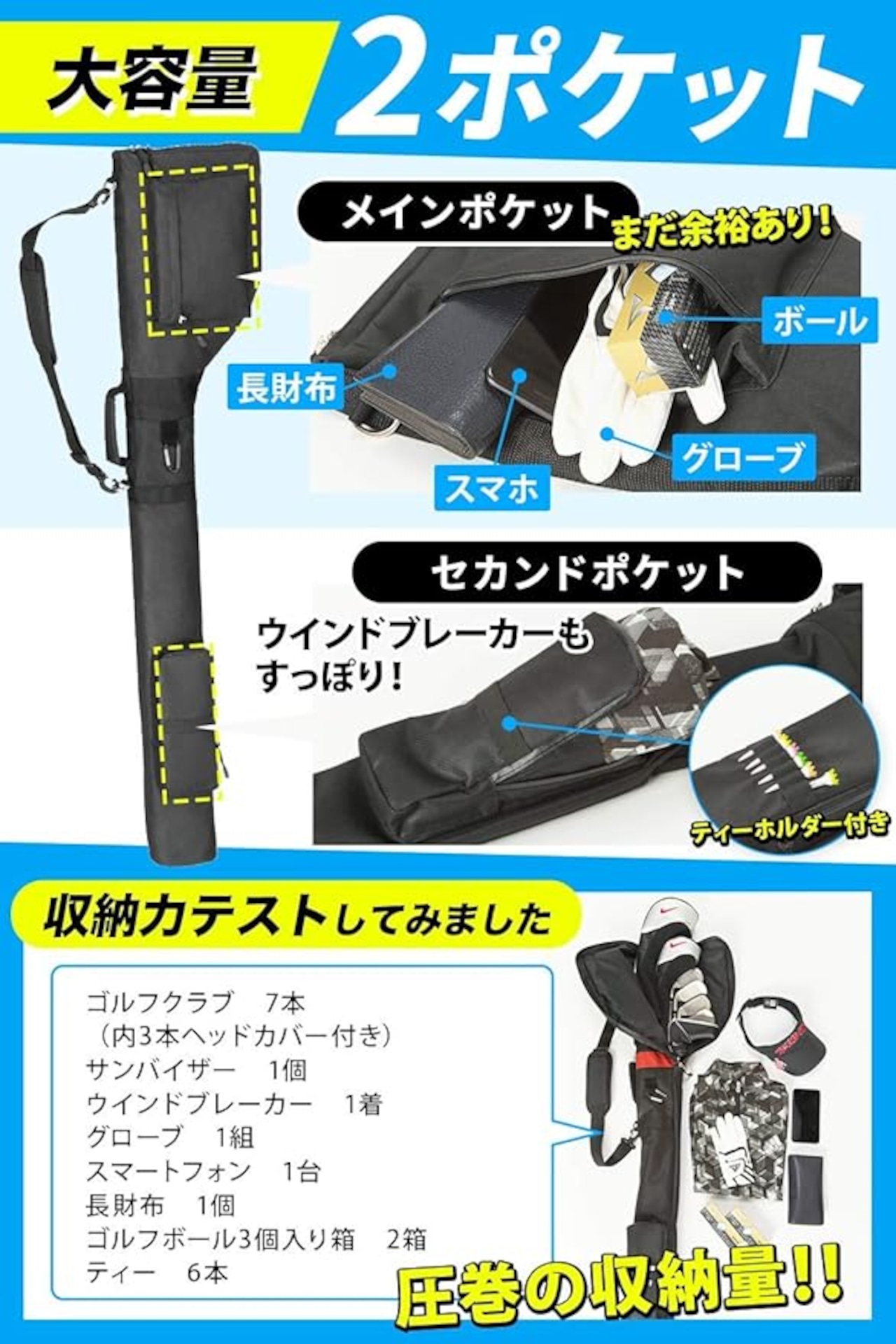 ✅【 大容量の2ポケットで収納力2倍 】ヘッド側のメインポケットはマチ付きで長財布もすっぽり。グリップ側のセカンドポケットは小3.5mmのマチあり!成人男性標準サイズのウインドブレーカーが余裕で収納。ポケット表面にティーホルダーあり。