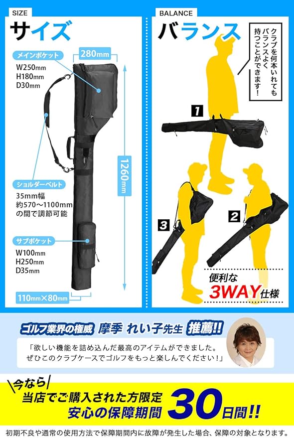 ✅【 大容量の2ポケットで収納力2倍 】ヘッド側のメインポケットはマチ付きで長財布もすっぽり。グリップ側のセカンドポケットは小3.5mmのマチあり!成人男性標準サイズのウインドブレーカーが余裕で収納。ポケット表面にティーホルダーあり。