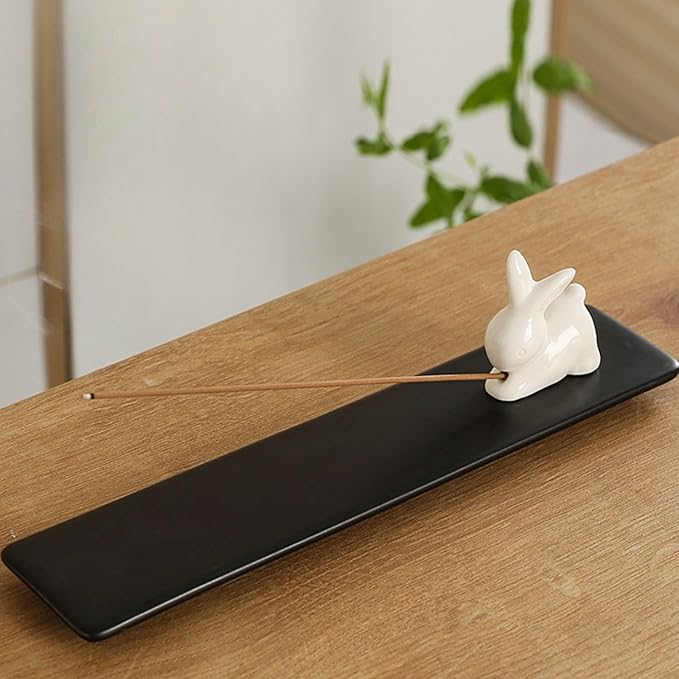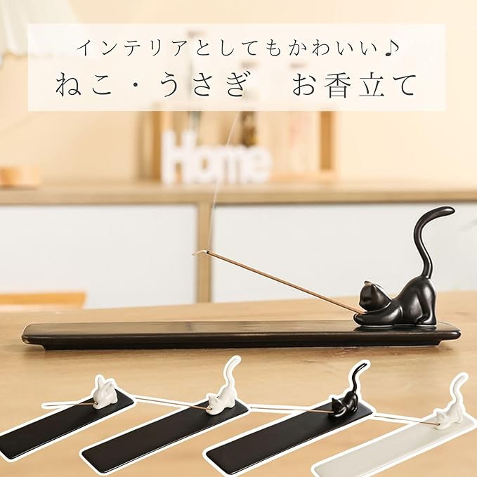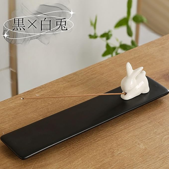 [HARGIO] お香立て 可愛い インセンスホルダー ねこ 猫 ネコ 線香立て おしゃれ 陶器 お香 香炉 仏壇用 線香炉 (黒 白兎)