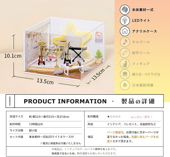【完成サイズ】 約 幅13.5 奥行13.5 高さ10cm 【サイズ分類】 小型 【制作時間】 12時間以内 【制作難易度】 ★☆☆☆☆(初心者OK!簡単!) 【セット内容】 素材一式&LEDライト&ケース付 【保証】:パーツ保証付。お届け後に万が一パーツが足りなかった場合、迅速に替えパーツをお送りさせて頂きます。