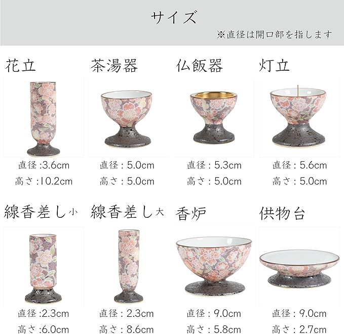 「彩花」シリーズの具足(仏器、茶湯器、花立、灯立、香炉)の単品販売です。他シリーズの線香皿や仏具、おりんと合わせての使用など、自由な組み合わせをお楽しみいただけます。