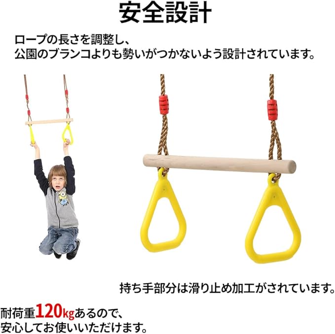 【安全設計】 ロープの長さを調整し、公園のブランコよりも勢いがつかないよう設計されています。 持ち手部分は滑り止め加工がされています。 耐荷重120kgあるので、安心してお使いいただけます。