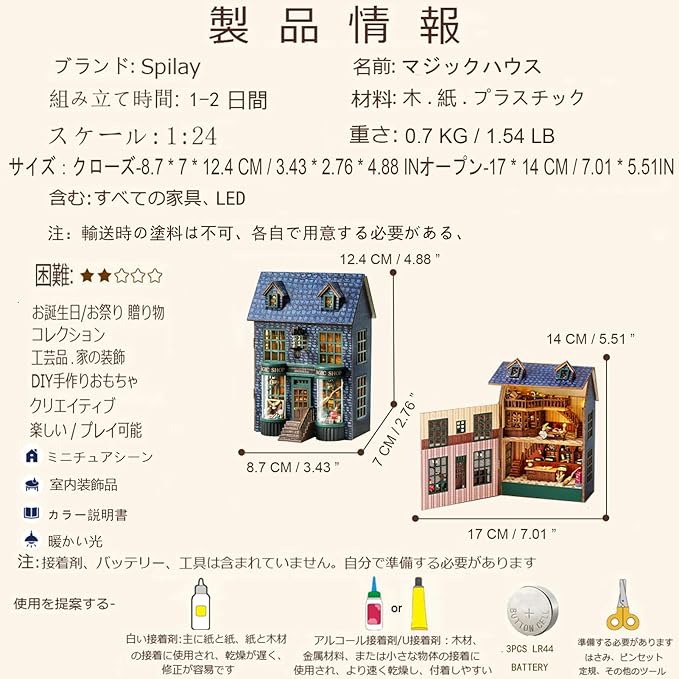 ♫♫♫【重要事項】DIYミニチュアドールハウスキットは、付属品が完全で欠品がないことを確認するために、納品前に100%注意深くチェックされています。 組み立ての際にご不明な点がございましたら、お気軽にお問い合わせください。問題が発生した場合は、できるだけ早く解決いたします。 また、シリコン液体接着剤と電池2個(AAA型)は航空輸送が禁止されているため、ご自身でご用意いただく必要があります。