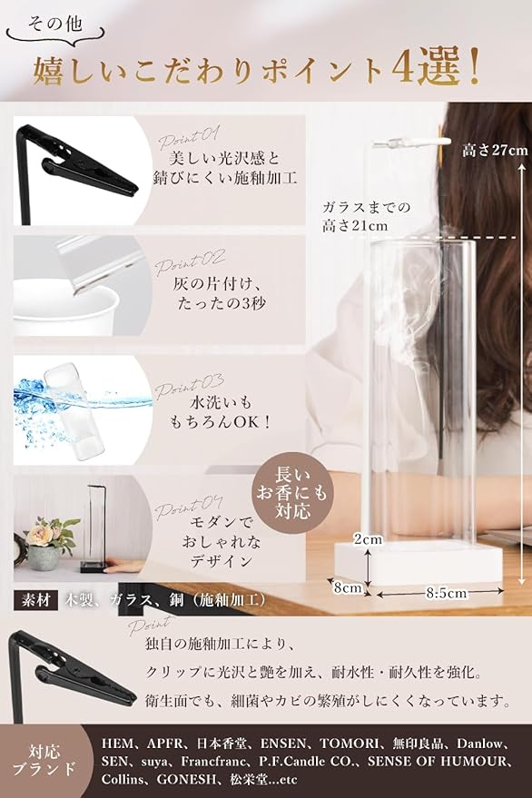【多様なお香に対応】 クリップ型の構造により、さまざまなタイプのお香に対応可能。 ※線香タイプのご使用時は、熱によりクリップが変色する場合があります。また、お香を下向きに焚くタイプでは、クリップ部分にベタつきが生じることがあります。