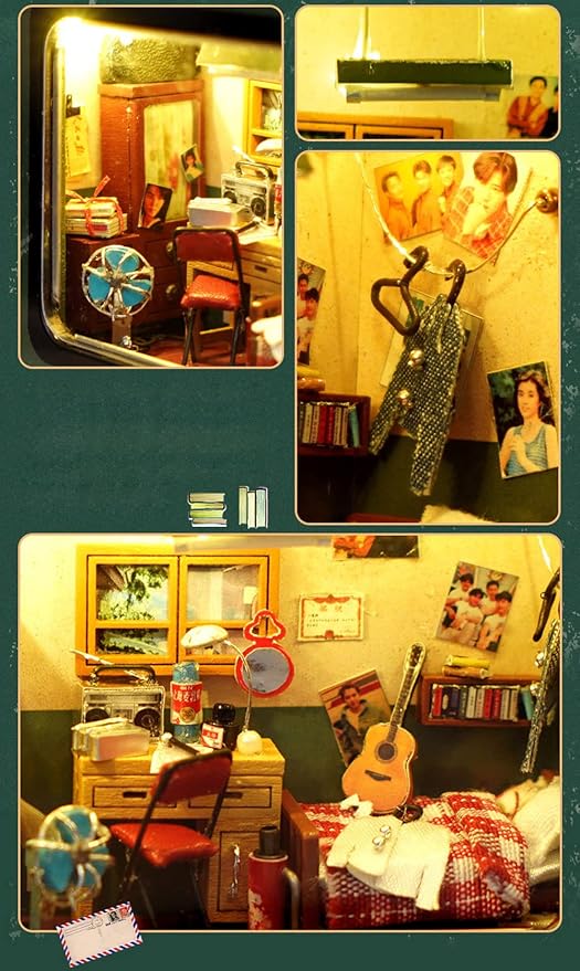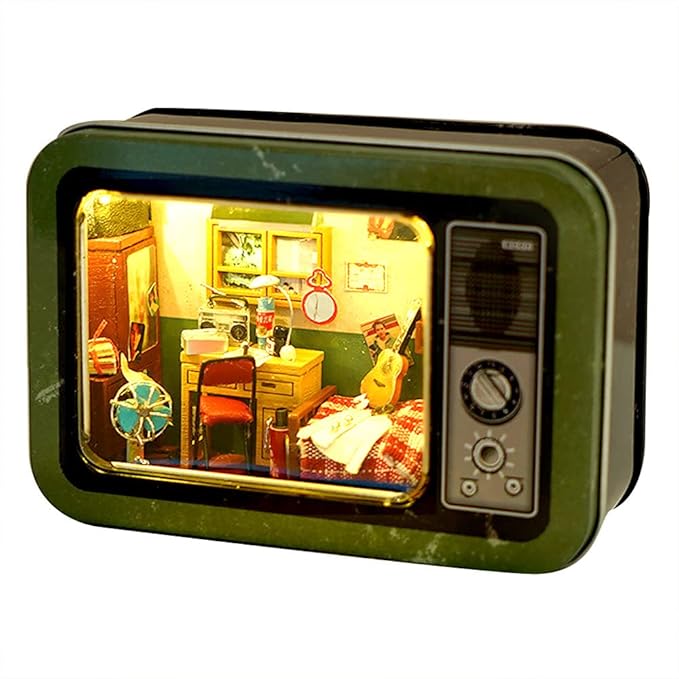 moin moin ドールハウス ミニチュア 手作りキット セット 手のひらサイズ 缶 小物入れ 昭和 TVの中 和風 レトロ テレビ 型 グリーン 実家の自分の部屋 | LEDライト 2110dh297