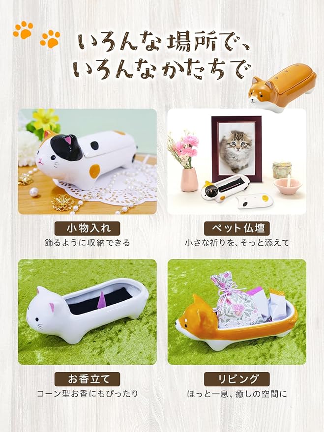 【使っていない時も可愛いオブジェに】 とことこ歩く猫や犬の姿がとても愛らしく、線香を焚いていないときもインテリアオブジェとしてお部屋に癒しを添えます。和室にも洋室にもなじみやすいナチュラルなデザインで、来客時の話題にもなるほどの可愛さです。