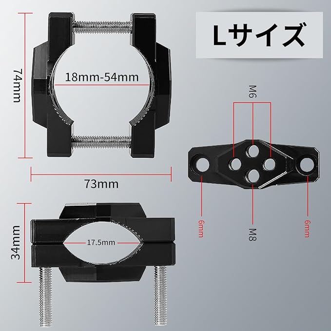 【製品仕様】:サイズ:Φ約18mm~54mmに適用。材質:本体:T6アルミニウム合金、ネジ:304ステンレス製。ネジ穴:M8x1、M6x3、セット内容:固定ステーx2個セット。