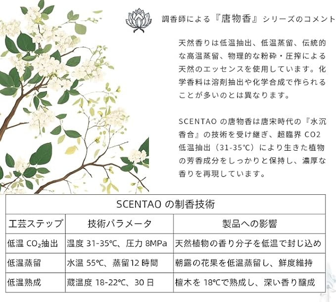 伝統低温抽出:「水沉香合」技法を用い、超臨界 CO₂低温(31 - 35℃)で天然香を抽出。「礼を育て、心を養い、健康をサポート」という三つの原則を貫いています