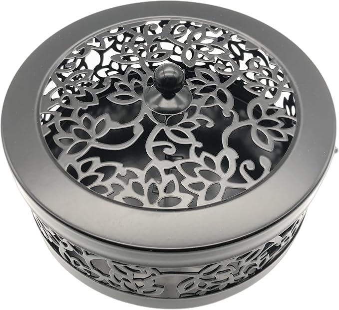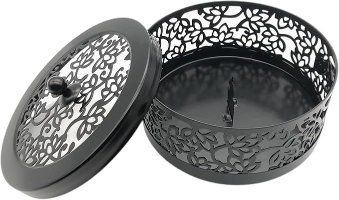 Ansimple 鉄製 蚊遣りケース 蚊取り線香ホルダー 蚊取り線香入れ 蚊取り線香立て ロータスモチーフ 光沢 室内 室外 アウトドア適用 インテリア ハンドル付き フタ付き (ロータスモチーフ,黒色)