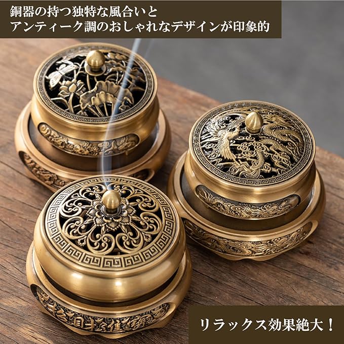 リラックス効果絶大!銅器の持つ独特な風合いとアンティーク調のおしゃれなデザインが印象的な多機能丸香炉です。