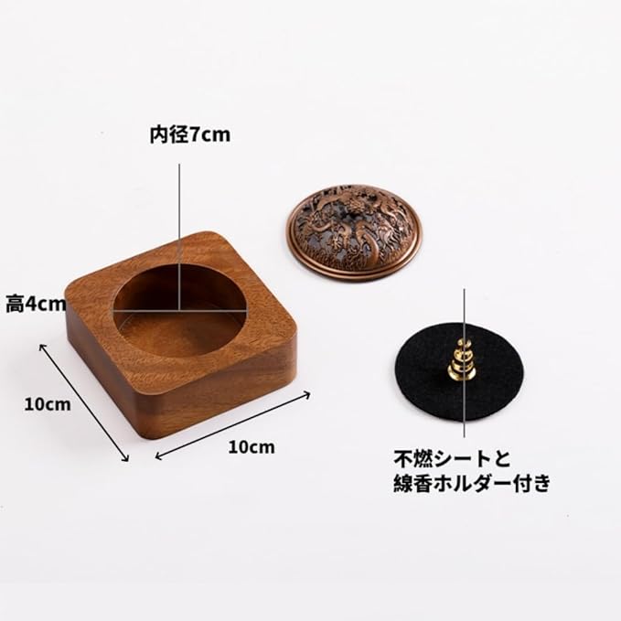 蓋付き、灰の舞い上がりがなく、お手入れ簡単。不燃シート内蔵、渦巻き香/コーン香用に最適、置くだけ使用便利。