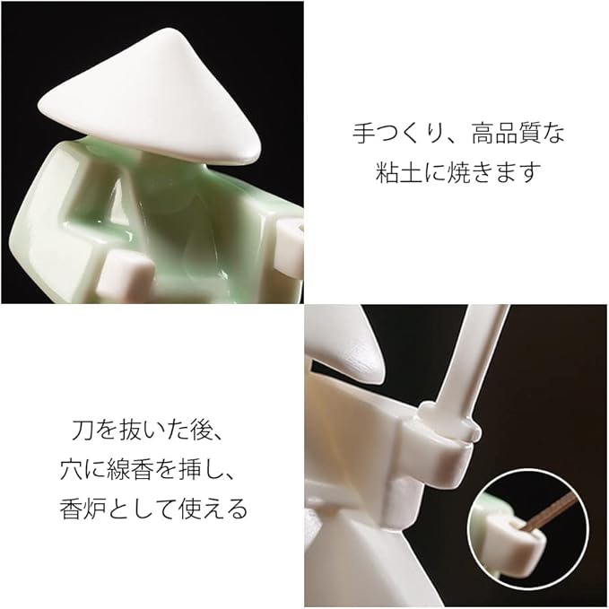 ●装飾性:お香立てセットは笠をかぶる・刀を持つ侍の外観、幾何学的要素があります。白と青二つ色が選択できます。線香を立てるとき、お香立てセット全体はシンプルで美しいです。