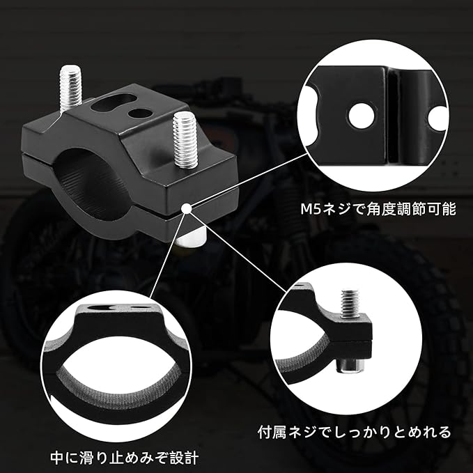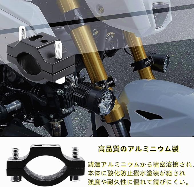 「高品質のアルミニウム製」鋳造アルミニウムから精密溶接され、強度や耐久性に優れ、鉄製より錆びにくいパイプステー。さらに、本体に酸化防止撥水塗装を施したので、防水防塵できてアウトドアでの使用にピッタリなアイテムです。 「取り付け簡単でしっかり固定、耐環境性も高い」強度や耐久性に優れるさびにくい鋳造アルミニウムを素材に使用アウトドアでの使用にピッタリ。穴などをあけずに付属の六角レンチとネジでしっかりとめれるので、ライトを逆さに付けれたり自由にできるのでとても便利です。 【しっかり固定しライトが揺れない】バイクブラケットをステーとして使い、作業灯、フォグランプなどを動かさないようにするです。挟みこみタイプなので、さまざまな箇所に取り付け可能で、ブラケットの位置は固定ネジを緩めることで簡単に変更することが可能です。 「様々な車両や作業現場で活躍する」フォグランプや作業灯などをパイプにしっかり固定できる挟み込みタイルですので、バイクのハンドルにフォグランプをつける時、トラックや自動車のサブライト、サイドライト取り付けに作業現場での夜間用照明や非常灯、家庭内ガレージ、倉庫内の室内灯設置にも適用できます。