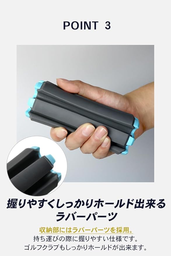 【握りやすくしっかりホールド出来るラバーパーツ】収納部にはラバーパーツを採用。持ち運びの際に握りやすい仕様です。ゴルフクラブもしっかりホールドが出来ます。
