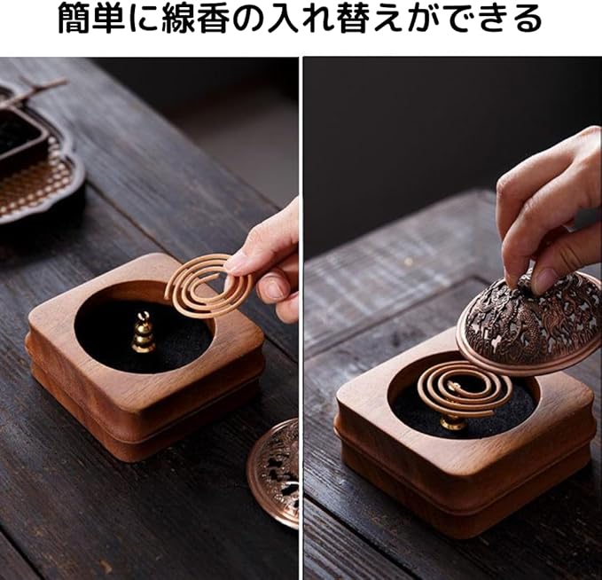 【製品仕様】内容:お香立て、銅蓋、不燃シート 適用:渦巻き香/コーン香 サイズ:約10x10x3.5cm 内径:7cm 材質:胡桃木製、銅 バリエーション:龍と鳳凰、ストライプ、竹編み(古銅)、竹編み(青銅)