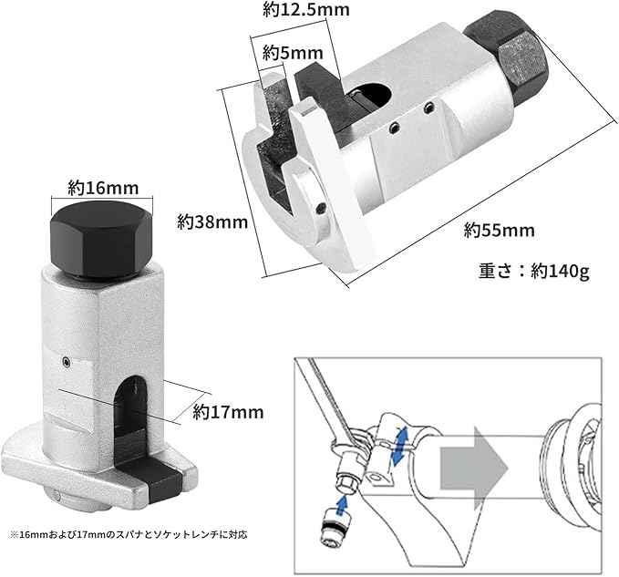 作業時には16mmおよび17mmのスパナとソケットレンチをご用意ください。ショックやナックルの固着解除時にも有効で、整備士はもちろん車好きの方のガレージツールとしても活躍する一品です。