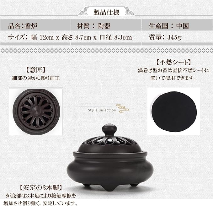 重厚感・高級感があるので、お部屋のインテリアに、またショップのディスプレイにもピッタリです。 ギフトとしてもおすすめです。香炉・蓋共に陶器製なので水洗いOKです。