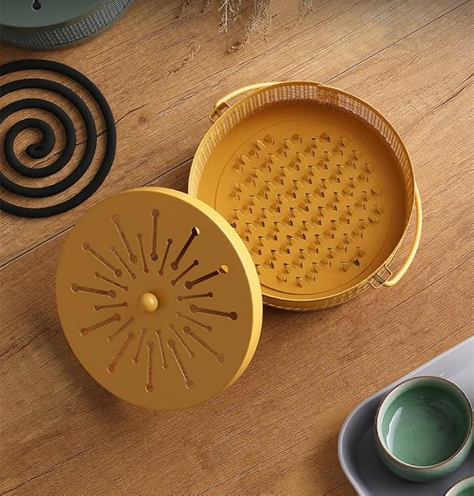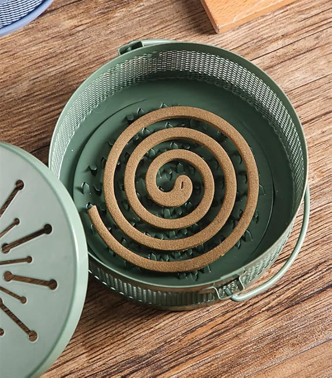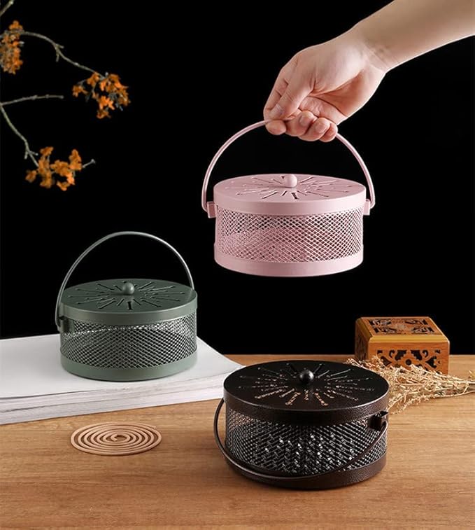 鉄製でどっしりした重さがあり、蓋と取っ手付きのオシャレな蚊取り線香ホルダー。穴より風通しがよく、可愛らしい丸い取っ手の蓋と3点の足も付いていますので安全性があります。
