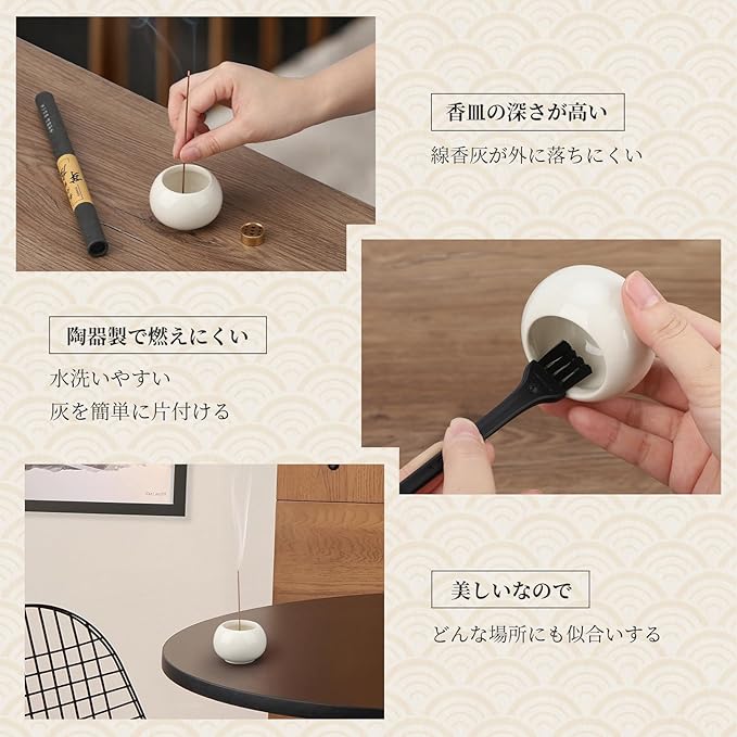 【おしゃれで美しい香炉】鉢のような形をした台座。空気が静かなときには、ミソハギやアオイのように煙はまっすぐ上へ。不規則なゆるい風が漂うときには、白いバラや牡丹のよう。窓からさっと強い風が吹くとたちまち消えて、風がやむとじわりと咲きだす煙の花。 お線香が燃えすすむに従って、灰はほろほろとお皿の中へ。
